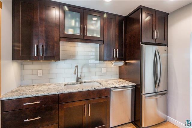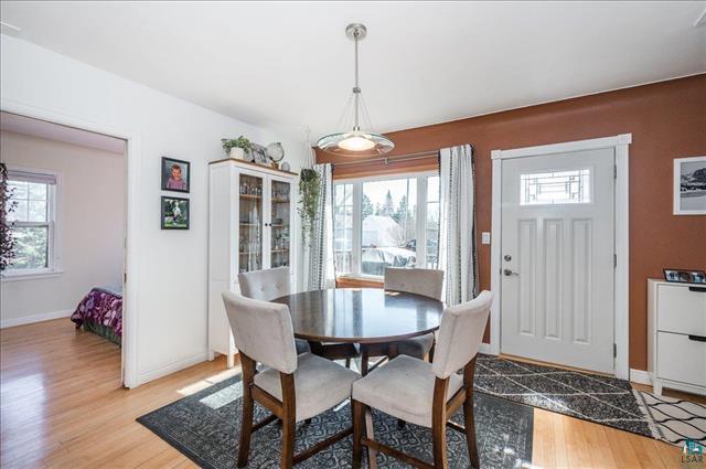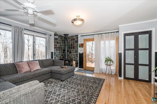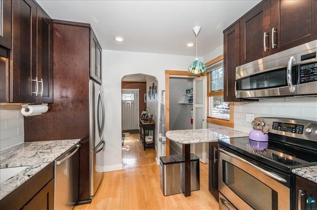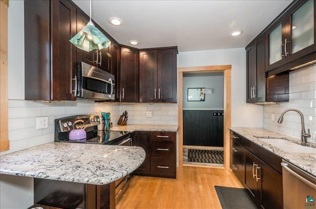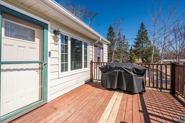 Feel like living in the woods while being in the heart of the City? This beautiful house sits on a double lot (1/2 acre) with State Land behind it. You’ll enjoy the wooded privacy as you sit in your living room that has big windows, a fireplace and hardwood floors. Kitchen has granite countertops, glass subway tiles and a breakfast bar. Formal dining with maple floors and coved ceiling. Two main floor bedrooms and a beautiful main floor bath with marble tile – it’s so fancy with even a heated toilet and bidet! Upstairs is a 3rd bedroom and another room to use as a den, office or playroom. Basement has a family room, sauna, laundry and lots of storage. One car garage and ample off-street parking. Deck, huge shed and partially fenced yard. Minutes to mall area yet you can enjoy hiking, X country skiing or just playing in the woods and near the pond right behind you.